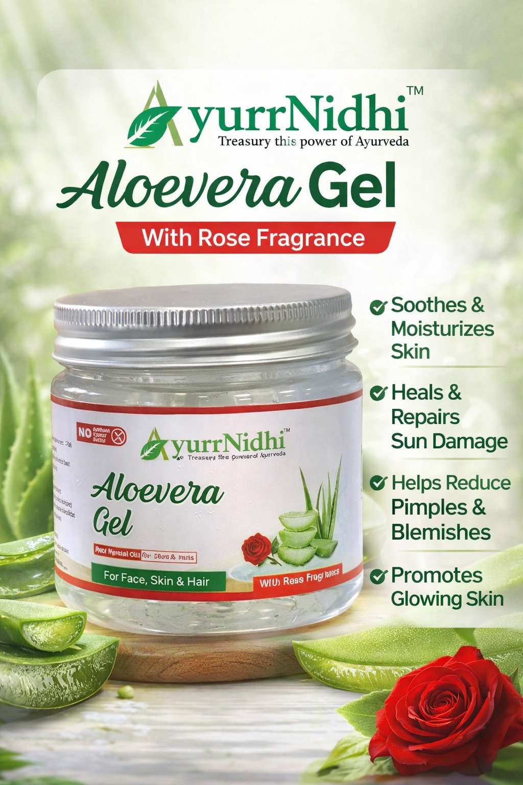 Designed for Indian skin and climate, AyurrNidhi Aloe Vera Gel with Rose Fragrance proudly stands among the best aloe vera gel in India, offering nature-inspired care with a refreshing sensory experience.