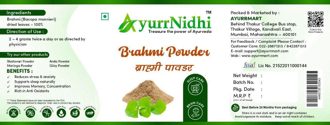AyurrNidhi Brahmi Powder is a pure Ayurvedic brain tonic made from high-quality brahmi powder. It supports better memory, sharp focus, stress relief, and overall cognitive wellness.